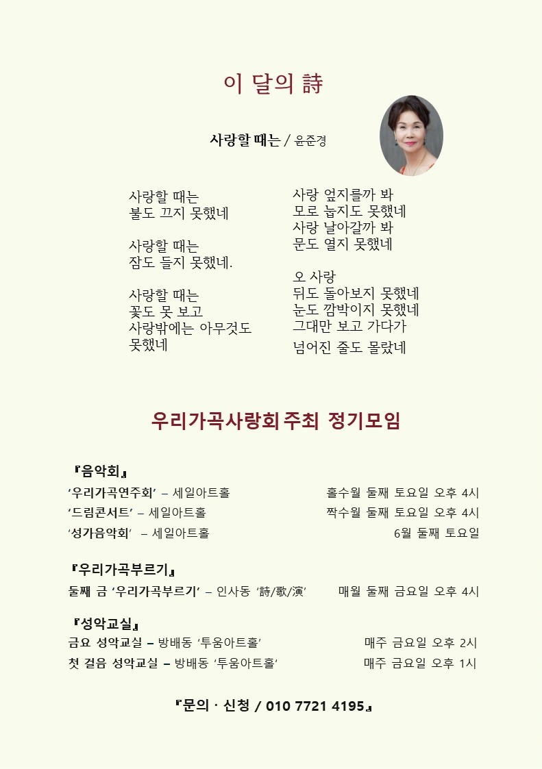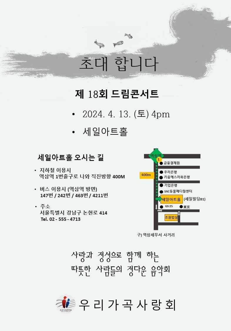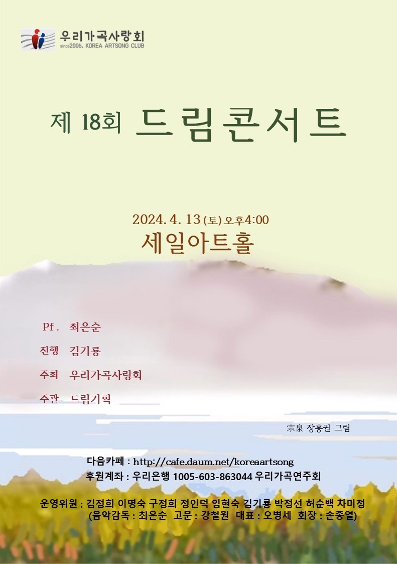 [스크랩] 우리가곡사랑회 주최 - 제 18회 드림콘서트 2024. 4. 13 (토) 오후 4시 세/일/아/트/홀 작성자손종열|작성시간24.04.04|조회수8 목록 댓글 0 글자크기 작게가 글자크기 크게가 다음검색 스크랩 원문 : 우리가곡사랑회 현재 게시글 추가 기능 열기 북마크 공유하기 신고 센터로 신고 댓글 댓글 0 댓글쓰기 답글쓰기 댓글 리스트