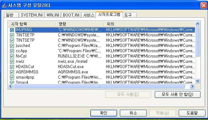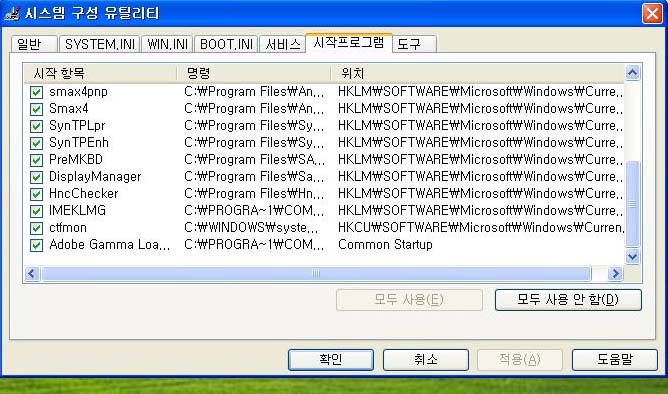 2. 시작프로그램에 등록된 것은 부팅과 동시에 자동 실행되는데 pc를 외부에 연결시키는 인터넷과 유무선 모뎀, 키보드, monitor, sound card 용 driver 등이 기본적으로 등록되어 있더군요.