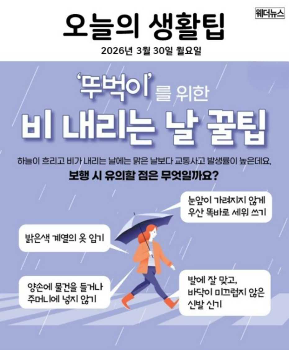 오늘의 생활 팁 - 뚜벅이를 위한 비 내리는 날 꿀팁 작성자스페셜윈|작성시간26.03.30|조회수167 목록 댓글 5 글자크기 작게가 글자크기 크게가 오늘은 전국적으로 비가 내린다고 하네요.안전사고에 유의하세요. 다음검색 현재 게시글 추가 기능 열기 북마크 신고 센터로 신고 댓글 댓글 5 댓글쓰기 답글쓰기 댓글 리스트 작성자러브 | 작성시간 26.03.30 비 시르다~~~ㅠㅠ 작성자바부온달 | 작성시간 26.03.30 ㅎ비 맞는거 좋아하는 낭만적인..사람인데ㅎ낭만이 아니고 미친놈인가...^^ 작성자퍼니잭 | 작성시간 26.03.30 앞에서 비바람치면 우산 앞으로 기울여야하는디????? 그거에 대한 대비책을 보여달라 보여달라!!! 작성자환리 | 작성시간 26.03.30 감사합니다 작성자아봉 | 작성시간 26.03.30 그냥 집콕하는 중 댓글 전체보기