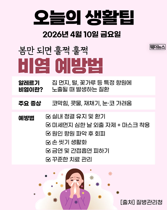 오늘의 생활 팁 - 비염 예방법 작성자스페셜윈|작성시간26.04.10|조회수78 목록 댓글 5 글자크기 작게가 글자크기 크게가 봄바람과 함께 찾아온 비염 생활 속 예방법을 소개합니다. 다음검색 현재 게시글 추가 기능 열기 북마크 신고 센터로 신고 댓글 댓글 5 댓글쓰기 답글쓰기 댓글 리스트 작성자뉴요커 | 작성시간 26.04.10 비염이 심한 사람인데 꿀팁 감사요..~~^^ 작성자퍼니잭 | 작성시간 26.04.10 마스크만 쓰면 만사오케바리??? 작성자러브 | 작성시간 26.04.10 외출자제인데15시간 돌아다니니 ㅠㅠ 작성자그런거양 | 작성시간 26.04.10 비염 정말 시르다~~ㅜㅜ 작성자미륵산 | 작성시간 26.04.13 비염 환자한테 밖에 나들이 조심해야할 계절이 찾아왔군요.예방법을 준수하여 건강관리를 잘 하시기 바랍니다 ~~^^ 댓글 전체보기