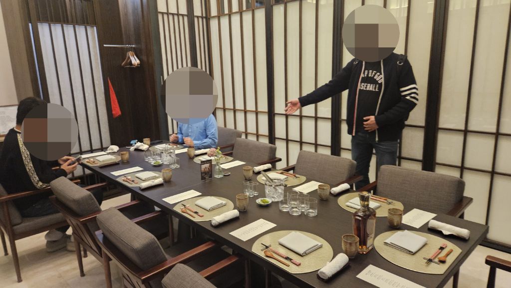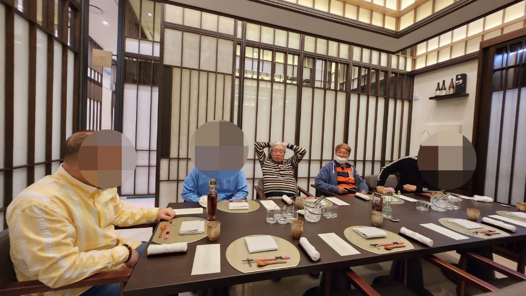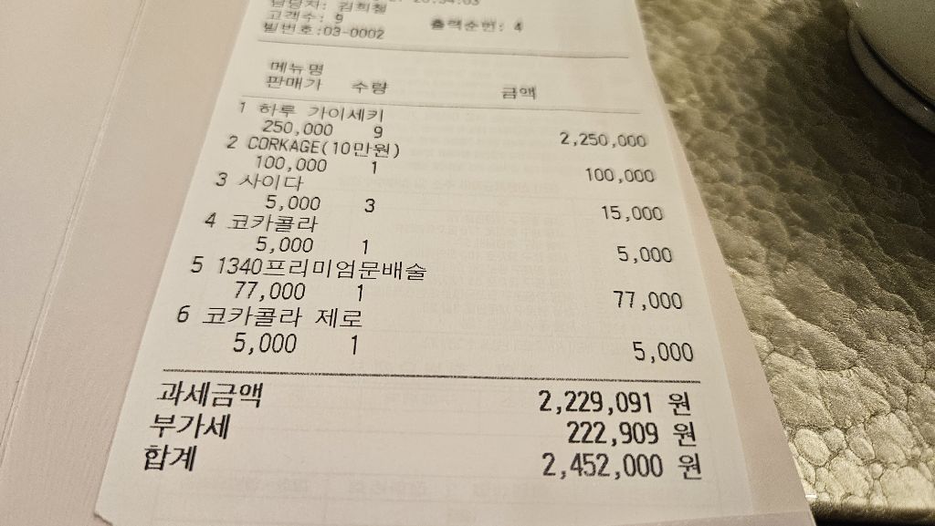 일인당 25만원의 코스 요리에 콜키지 10만원 등 하여 9명이 식사하고 245만원이 나왔습니다..
