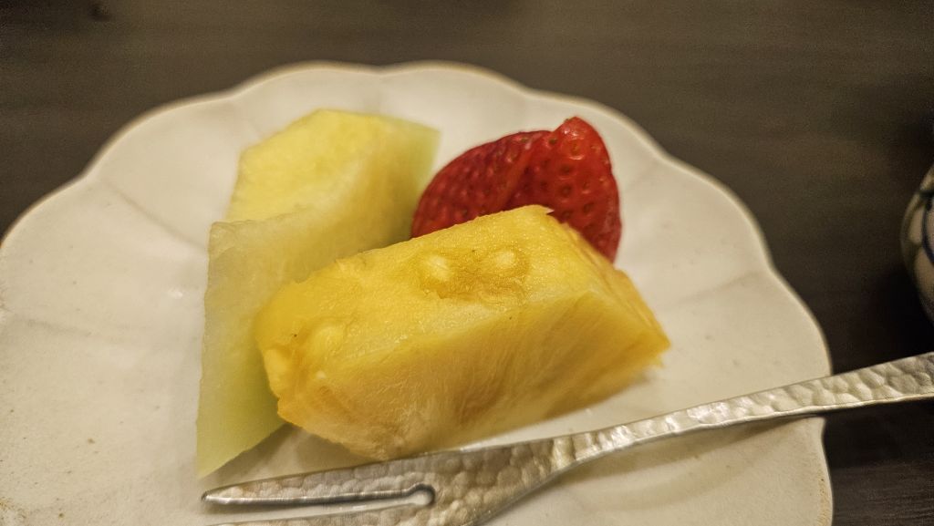 후식 과일을 마지막으로 2시간이 더 걸린 코스 요리 식사는 끝납니다..