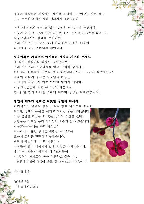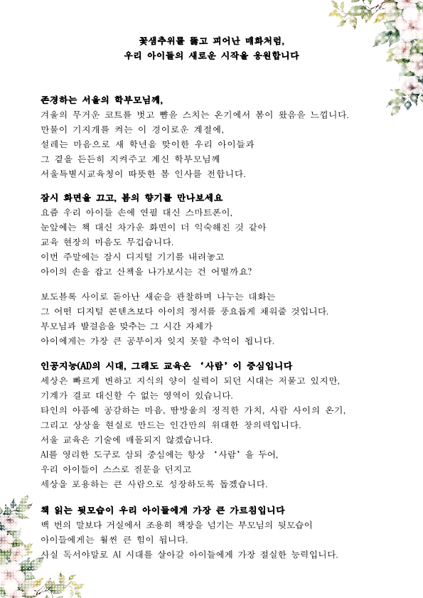 2026 신학기를 맞이하여 학부모님께 드리는 글(서울특별시교육청 이첩) 작성자소화유치원|작성시간26.03.23|조회수11 목록 댓글 0 글자크기 작게가 글자크기 크게가 다음검색 현재 게시글 추가 기능 열기 북마크 공유하기 신고 센터로 신고 댓글 댓글 0 댓글쓰기 답글쓰기 댓글 리스트