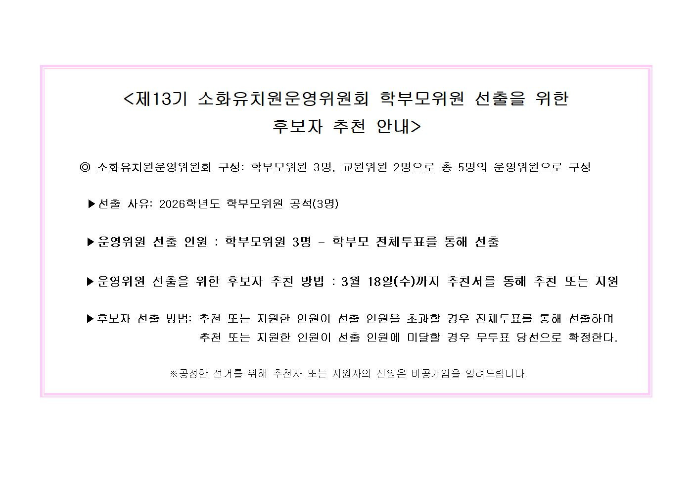 제13기 소화유치원운영위원회 학부모위원 선출 공고 작성자소화유치원|작성시간26.03.12|조회수19 목록 댓글 0 글자크기 작게가 글자크기 크게가 다음검색 현재 게시글 추가 기능 열기 북마크 공유하기 신고 센터로 신고 댓글 댓글 0 댓글쓰기 답글쓰기 댓글 리스트