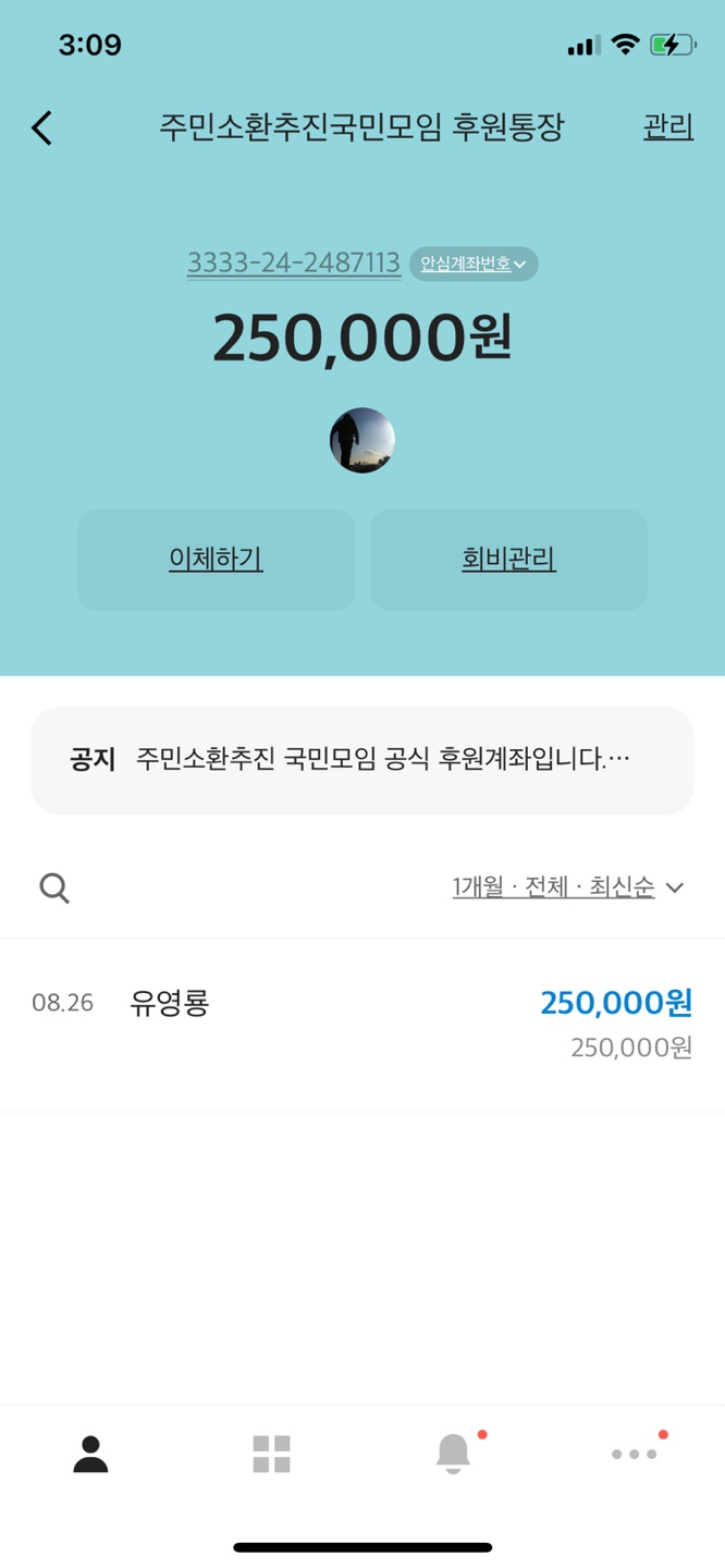 금일 2022년 8월 26일, 나선주(길손)님으로 부터 후원금 잔액 250,000원을 제 개인 계좌로 이체 받아, 새로 개설한 우리 모임 통장에 이체 완료 하였습니다.