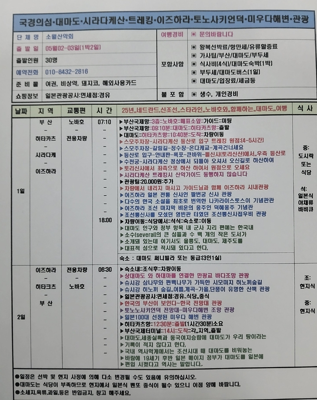 ■일정 터치 하시면 확대 보실 수 있습니다 ■ 일시:26년5월2일-3일(토일)대전-부산-쓰시마-부산-대전 출발:월드컵역2번03시25분-유성홈플30-월평역1번33-갈마역1번35-둔산이마트37-유승기업42- 롯데백화점45-복록수50-시민뒤(GS)04시-대전도시공사(IBK)3-한국병원13-대전IC원두막04시20분 ●회비37만/식사4회 제공/첫날 조식 오는날 석식 개별/기본3인실/2인실 두명5만 별도 ●여권준비 댓글 또는 문자 예약. 하세요>>010 8432 2816 |