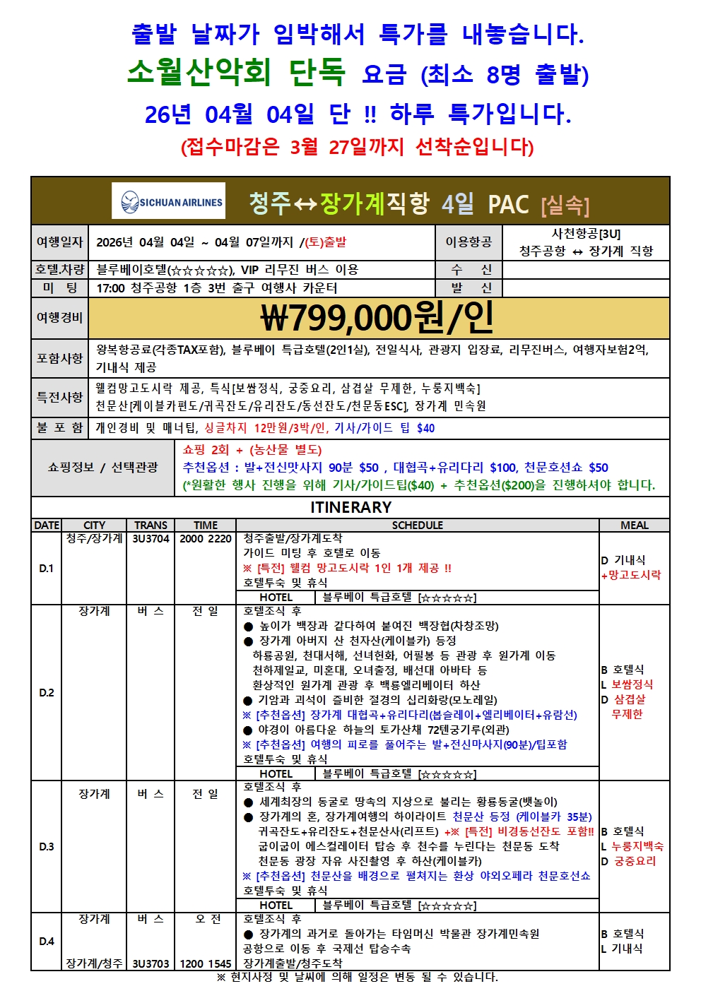 특가4/4일 출발/마감일>3/27일 까지 작성자소월카페지기|작성시간26.03.16|조회수523 목록 댓글 0 글자크기 작게가 글자크기 크게가 다음검색 현재 게시글 추가 기능 열기 북마크 공유하기 신고 센터로 신고 댓글 댓글 0 댓글쓰기 답글쓰기 댓글 리스트