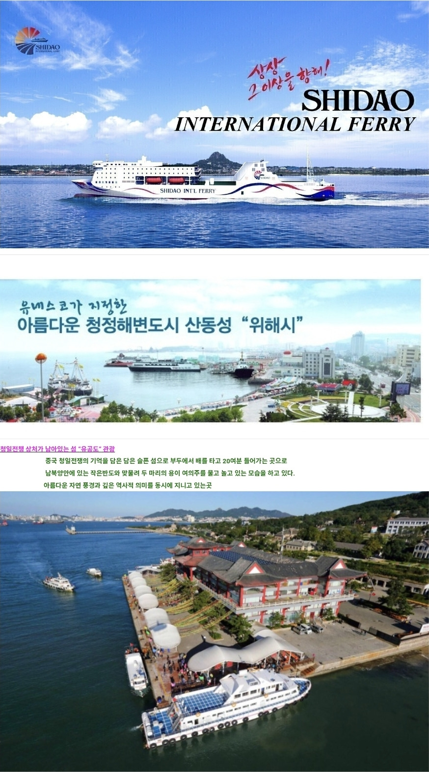 | 3일 | 위해시 유공도 석도항 | 전용버스 | 07:00 - - - - - - - - 16;00 19:00 - | ▶기상::조식(호텔식)후::관광지로 이동 ▶청일전쟁의 상처가 남아있는,섬,유공도 해변 트레킹 및 관광 ▶섬,,전체::(유람선 및 전동카):입장료 포함, ▶중국 청일전쟁의 기억을 담은 슬픈 섬으로 유람선타고,20분) ▶남북양안에 있는 작은반도와 맞물려 두 마리의 용이 ▶영의주를 물고 놀고 있는 모습과 기성산 해발 153m 있다 ▶아름다운 자연 풍경과 깊은 역사적 의미를 동시에 지니고 ▶있는 유공성 박물관-천혜의 절경 해변 산책 및 관광 입니다 ▶차량이동-식당에서 중식-석도으로 이동 ▶석도국제터미널::도착::출국장으로 이동 승선 ▶석도국제터미널::군산항으로 출발 | 조: 호텔식 중: 현지식 석: 선내식 |
