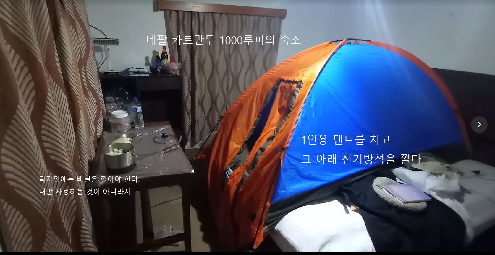 바뀐 것이라 곤 밍크담요가 깔려있고 히터가 들어오는 곳도 있지만 대개의 호텔은 아열대지역이라 겨울에도 난방은 없다고 봐야 한다