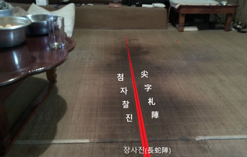 '첨자찰진(尖字札陣)'이나 '장사진(長蛇陣)'의 전법은 무운구들 놓기에서 '관통로(貫通路)'기법에 해당하여 아궁의 뜨거운 화 열을 식지 않은 상태로 해서 윗 목으로 무조건 밀어 빠르게 밀어 넣는다는 점이 비슷하여 설명 상 비교한 것이고 무운구들의 4번째 '역행(力行)'의 기법이고 또 하나는 '관통로(貫通路)'기법이다.