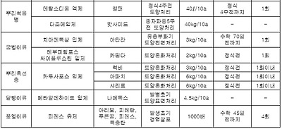 음 잘 섞여 사용한다(10a 당 소요량은 생석회 50kg, 산화고토 18kg, 구연산철 20kg)