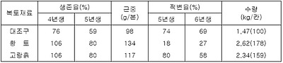 ○ 삼요소 성분량 : 흡수량, 질소 18.7kg, 인산 5.6kg, 칼리19.4kg/10a (6년간)