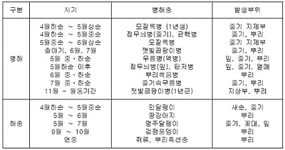 심하게 발생하는데 발생시기는 봄철 건조기에 토양이 건조하기 쉬운 5월 하순부터 6월 상