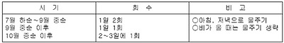 ○ 개갑단계 : 8월 상순∼9월 중순까지 1일 2회 관수, 9월 하순∼10윌 중순까지 1일 1회