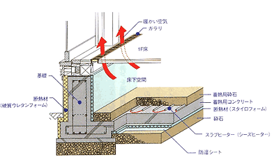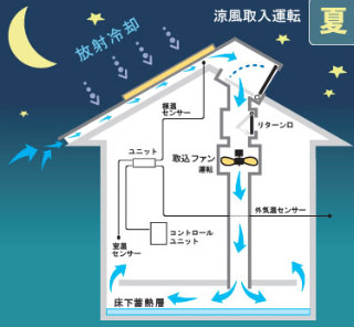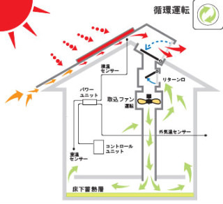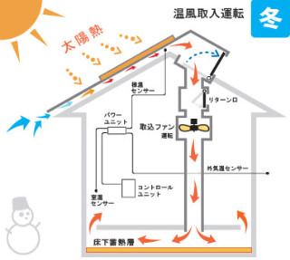 이 시스템을 적용한 주택은 난방이 필요한 동절기에는 지붕에 쏟아지는 태양의 열로 공기를 따뜻하게 해 그것을 마루밑에 보내 기초 콘크리트(흙벽돌 축열체)에 열을 저축한다. 저축한 열은 저녁 이후 천천히 방열해 건물 전체를 마루로부터 따뜻하게 한다. 가동하고 있는 동안은 항상 신선한 바깥 공기를 실내에 넣고 있다. 난방하면서 환기를 할 수 있다고 하는 점이 겨울철 기능의 큰 특징이다. 처마끝으로부터 신선한 바깥 공기가 유입되어 그것을 지붕에 쏟아지는 태양의 열로 따뜻하게 하고 마루밑에 보낸다. 마루밑에 보내진 공기는 기초의 콘크리트(흙벽돌 축열체)를 따뜻하게 하면서 실내에 미풍이 되어 나온다. 저녁이 되면 열을 저축한 축열체가 바깥 공기온도의 저하와 함께 조금씩 방열하기 시작해 바닥마루로부터 건물 전체를 따뜻하게 한다. 덕트에 모은 뜨거운 공기는 핸들링 박스 내부에 있는 미소음(微騷音)의 동력팬에 의해 마루밑에 보내진다. 자립 운전형 핸들링박스 내의 팬의 동력은 태양광 발전을 이용하므로 에너지사용량은 Zero이다.