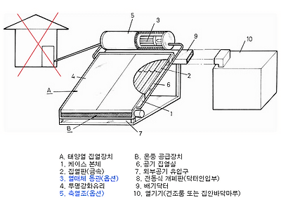 주택의 방향이 태양에너지를 잘 받아들이는 향(정남향)이 아니거나 여러 조건상 공기집열을 지붕에서 하기 어렵다면 아래 그림과 같이 별도의 공기집열장치를 외부의 특정장소에 따로 만들어서 태양열에 의해 데워진 따뜻한 공기를 집안 내부의 바닥 마루로 보내는 방법도 있다.