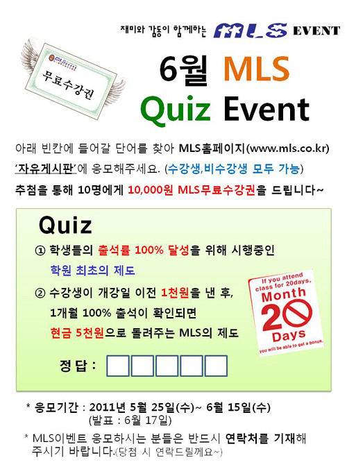 MLS홈페이지 → <자유게시판>에 퀴즈 정답을 올려주시는 분들 중 10명을 추첨하여 1만원 무료수강권을 드리며,수강생, 비수강생 모두 참여 가능합니다.