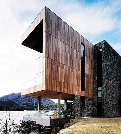 탁 트인 자연을 감상할 수 있는 별장을 의뢰했다. 통유리창으로 휘감은 전면과 천장 높이가