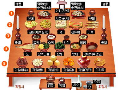 설날.추석. 명절에는 제사를 차례라고 한다. 가장 많이 지내는 명절은 설과 추석이다. 대보름날,한식,단오,중양절,동지등에 차례를 올리기도 한다. 설에 지내는 연시제(年始齊)와 추석에 성묘를 겸한 제사를 말한다. 차례에 모셔지는 조상은 4대조 까지 지낸다. 그러므로 차례이지만 보통의 제사처럼 제수를 장만하고 술을 올리며 제사 지내는 것이 관례이다. 묘사와 더불어 중요한 조상숭배의 의례로 꼽고 있다. 외지에 나갔던 부계 친족들이 모두 모이고, 다양한 민속놀이가 행해지기 때문에 오히려 더욱 강화되는 추세이다. 이날 차례를 올리는 것이 관례화 되어있으나, 북부지방에서는 추석의 차례가 유명무실한 편이었다, 이날 차례를 지내는 풍습이 강화되고 있다. 가까운 부계 친족끼리 모여서 지내되 종가에서부터 차례대로 지낸다. 무축단헌을 원칙으로 하여 지내는 것이 보편적인 현상이다. 기제사가 사망한 날을 추모하여 지내는 의례이고, 묘제가 4대조 이상의 조상의 묘를 찾아 추모하는 의례라면, 차례는 조상에게 계절, 해가 바뀌고 찾아옴을 알림과 동시에 시식과 절찬을 천신하는 의례이다. 즉 축문을 읽지 않고, 술을 한 잔만 올린다고 하나, 지방과 가문에 따라서는 다를수도 있으니 가통에 따라서 행한다. 다를 바 없으나, 설에는 떡국을 올리고, 추석에는 햅쌀로 송편을 빚어 햇과일과 함께 올린다. 차례는 자기가 기제를 받드는 모든 조상에게 지낸다. 설에는 떡국을 한가위에는 송편을 올린다. 차례는 주전자를 들고 제상 위의 잔반에 직접 술을 따른다. 차례는 모든 조상의 제상을 내외분 마다 따로 차리되 한번의 철차로 지낸다. 맨 위 조상 내외분부터 지내고 차례대로 몇 번을 지내는 집안도 많이 있으니 그 집안의 가통에 따를 것이다.