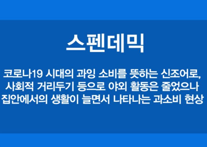 소비하다는 뜻의 영어 ‘스펜드(Spend)’와 감염병의 세계적 대유행을 뜻하는 팬데믹(Pendemic)을 합친 말로, 코로나19 팬데믹 상황에서 나타나는 과잉 소비를 이르는 말이다.