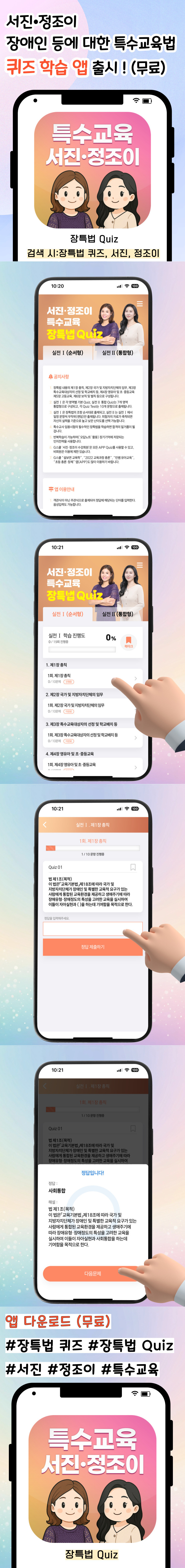 [G스쿨] 서진특수 | 서진⋅정조이 "(장특법) 퀴즈 학습 앱" 출시! - 무료 작성자서진특수연구소|작성시간25.05.26|조회수336 목록 댓글 2 글자크기 작게가 글자크기 크게가 다음검색 현재 게시글 추가 기능 열기 북마크 공유하기 신고 센터로 신고 댓글 댓글 2 댓글쓰기 답글쓰기 댓글 리스트 해당 댓글은 작성자와 운영진만 볼 수 있습니다. 해당 댓글은 작성자와 운영진만 볼 수 있습니다. 댓글 전체보기