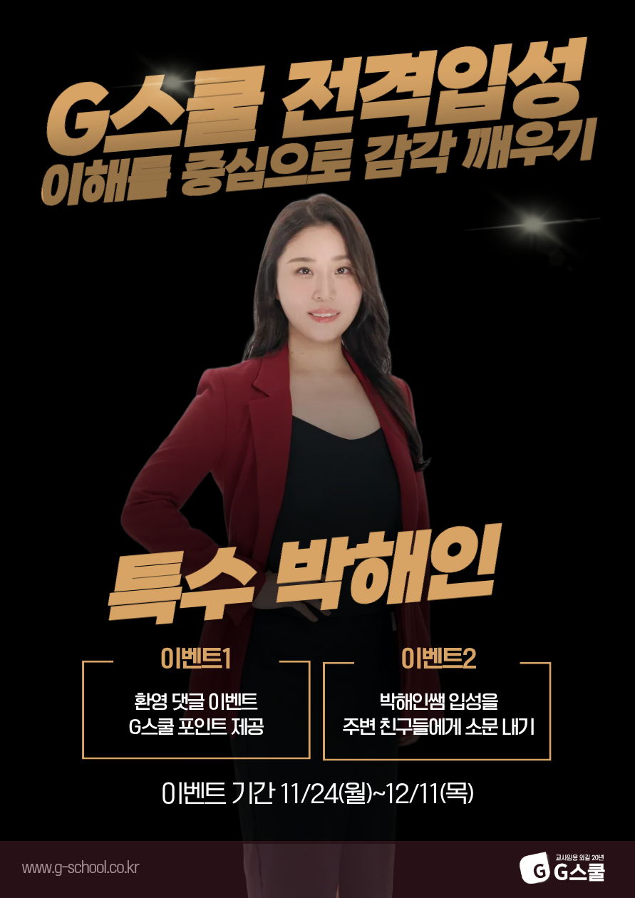 [G스쿨] [박해인 특수] 2027학년도 G스쿨 전격 입성 이벤트 안내 작성자G스쿨|작성시간25.12.09|조회수162 목록 댓글 0 글자크기 작게가 글자크기 크게가 다음검색 현재 게시글 추가 기능 열기 북마크 공유하기 신고 센터로 신고 댓글 댓글 0 댓글쓰기 답글쓰기 댓글 리스트