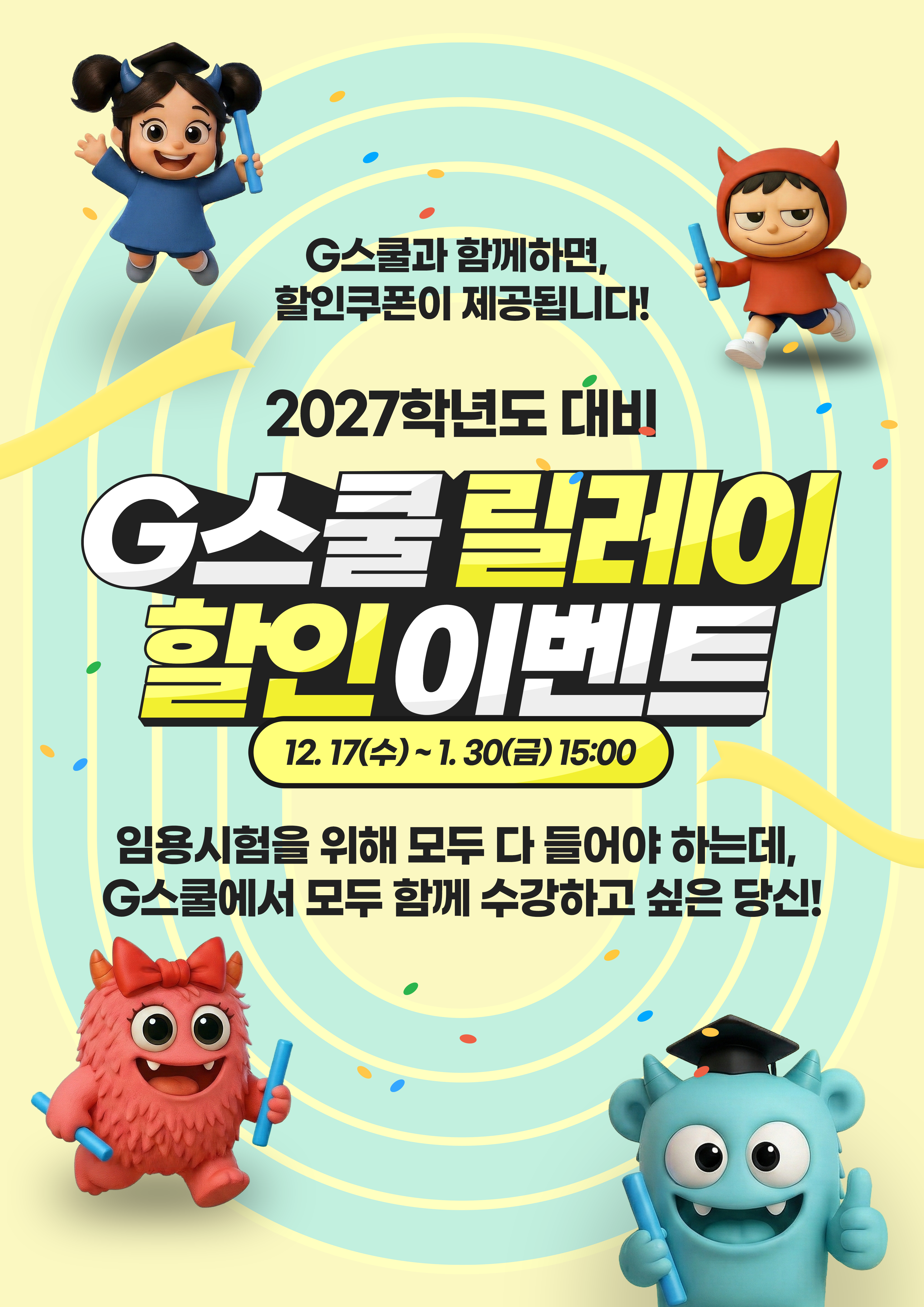 [G스쿨][이벤트] 유초특+일반유아&일반초등 함께하면 추가 할인 쿠폰 제공! 작성자G스쿨|작성시간25.12.17|조회수71 목록 댓글 0 글자크기 작게가 글자크기 크게가 다음검색 현재 게시글 추가 기능 열기 북마크 공유하기 신고 센터로 신고 댓글 댓글 0 댓글쓰기 답글쓰기 댓글 리스트