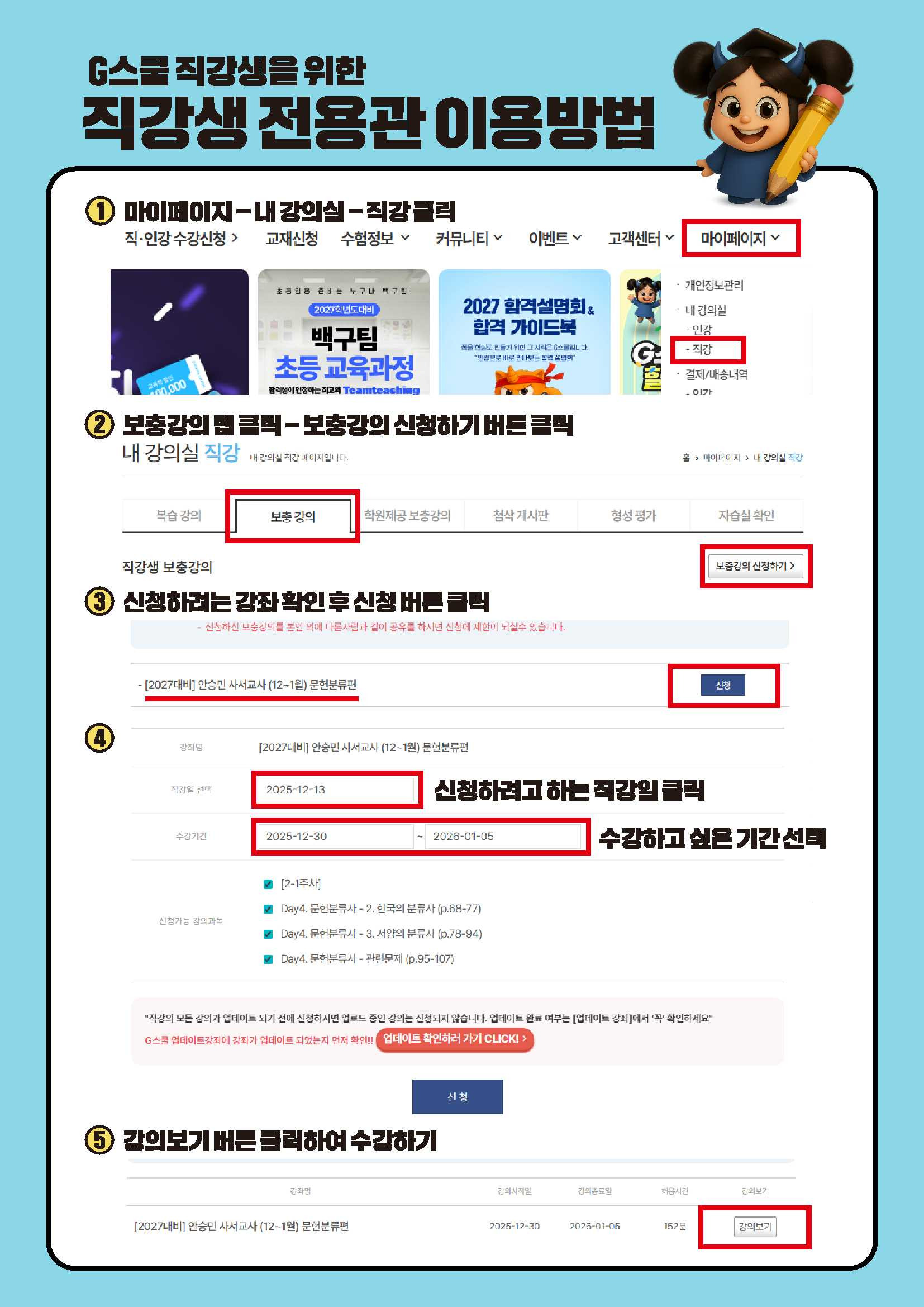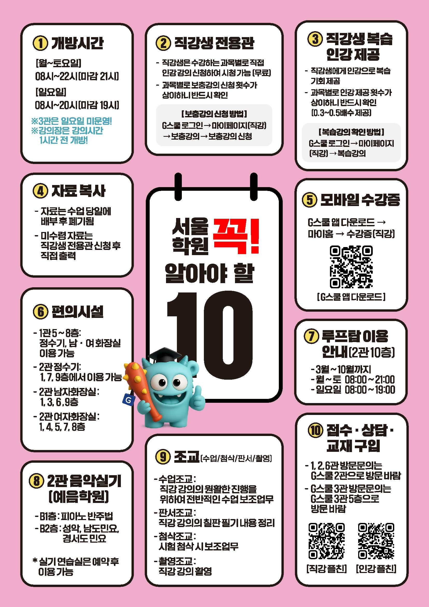 [G스쿨][박해인 특수] 직강 수강생을 위한 학원 이용 안내! 복습 동영상 이용 방법 작성자G스쿨|작성시간26.01.22|조회수190 목록 댓글 0 글자크기 작게가 글자크기 크게가 다음검색 현재 게시글 추가 기능 열기 북마크 공유하기 신고 센터로 신고 댓글 댓글 0 댓글쓰기 답글쓰기 댓글 리스트