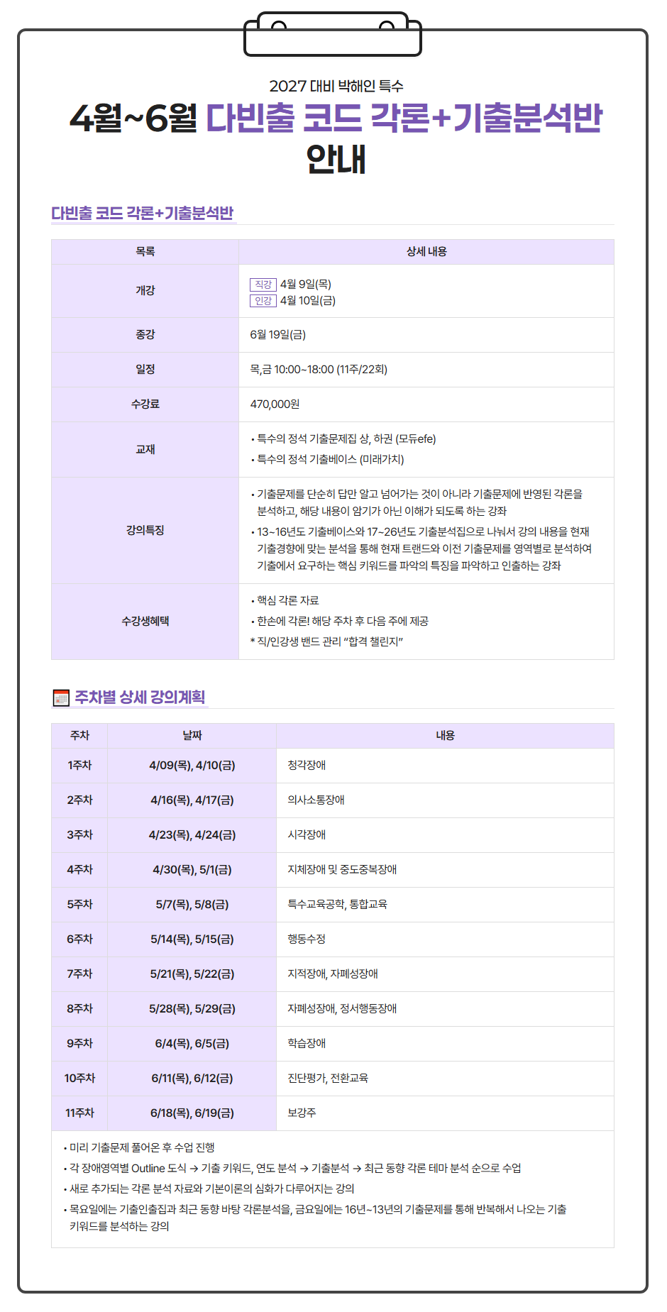 4월 9일 개강하는 박해인 특수교육 상세 강의계획 안내드립니다.