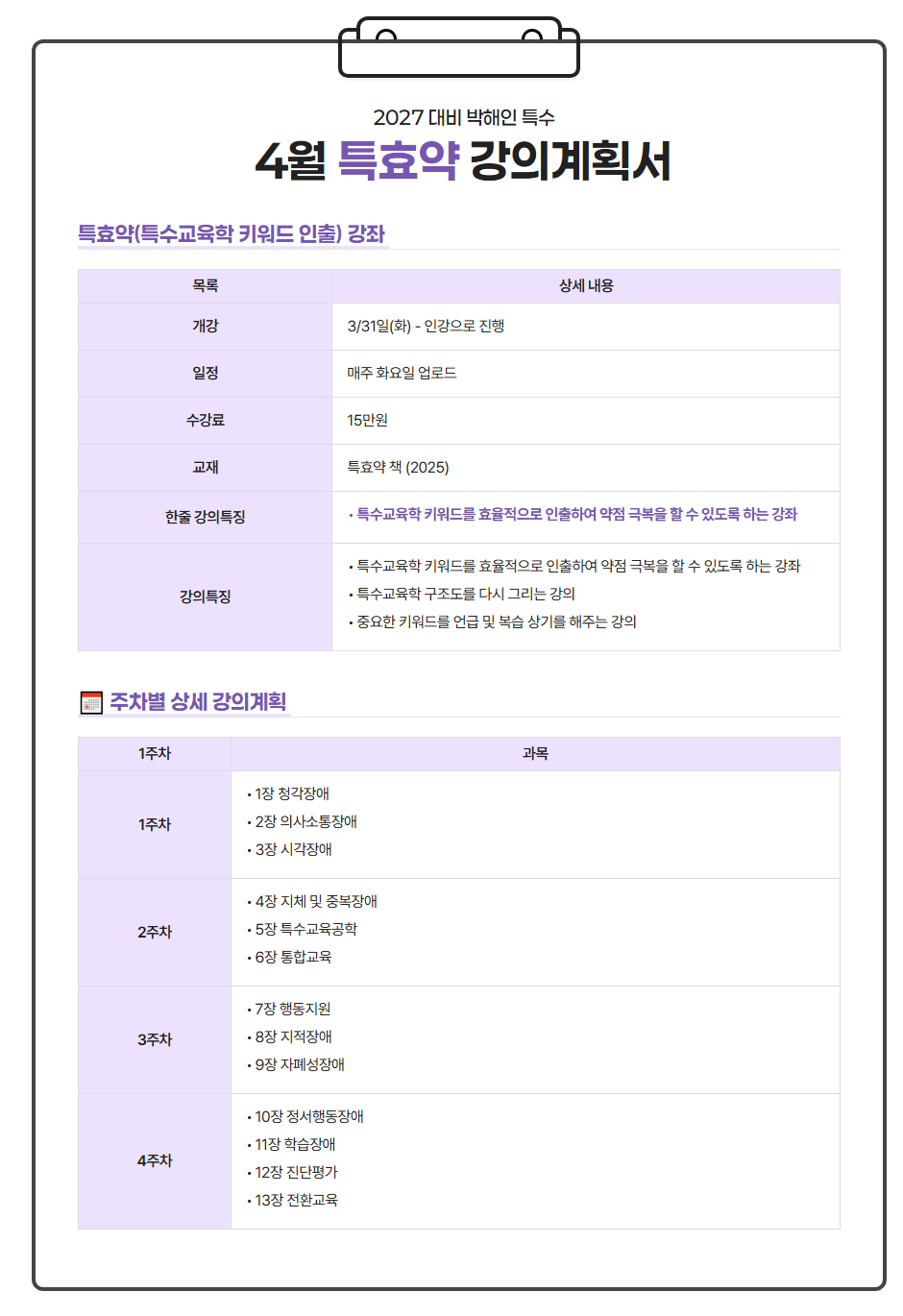 3/31(화) 개강하는 박해인 특수교육 상세 강의계획 안내드립니다.