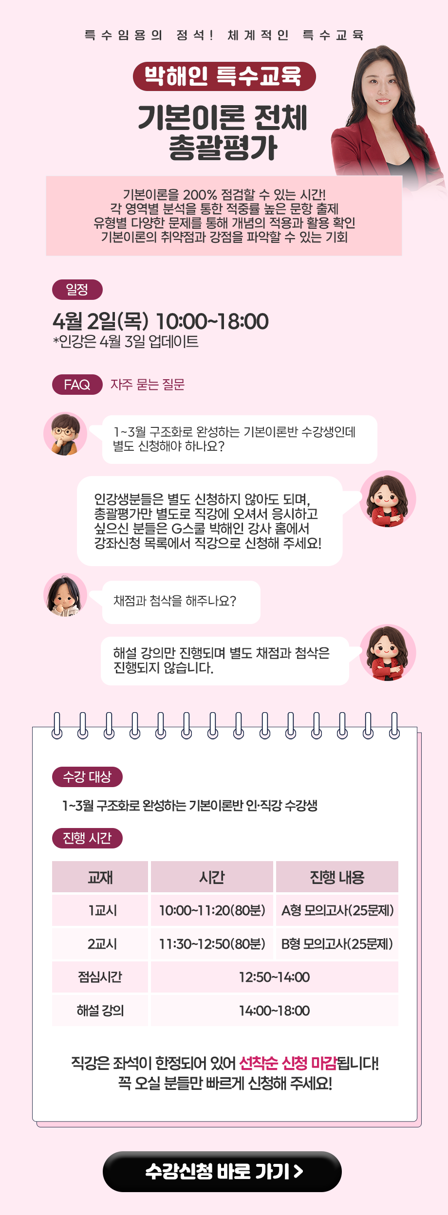 [G스쿨][박해인 특수] 1~3월 기본이론반 전체 총괄평가 진행 안내 작성자G스쿨|작성시간26.03.13|조회수264 목록 댓글 0 글자크기 작게가 글자크기 크게가 다음검색 현재 게시글 추가 기능 열기 북마크 공유하기 신고 센터로 신고 댓글 댓글 0 댓글쓰기 답글쓰기 댓글 리스트