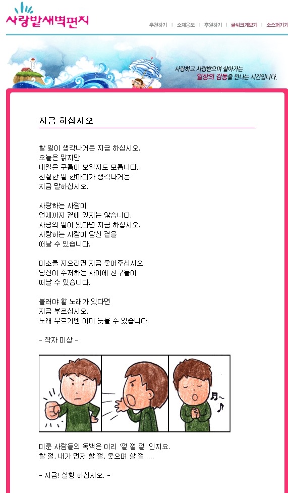 지금하십시오! 작성자831기안상철|작성시간11.09.01|조회수81 목록 댓글 1 글자크기 작게가 글자크기 크게가 다음검색 현재 게시글 추가 기능 열기 북마크 공유하기 신고 센터로 신고 댓글 댓글 1 댓글쓰기 답글쓰기 댓글 리스트 작성자無心 | 작성시간 11.09.01 계획은 미리 세우고할일은 미루지않고 때맞추어서 실행에 옮기도록 노력하겠습니다... 댓글 전체보기