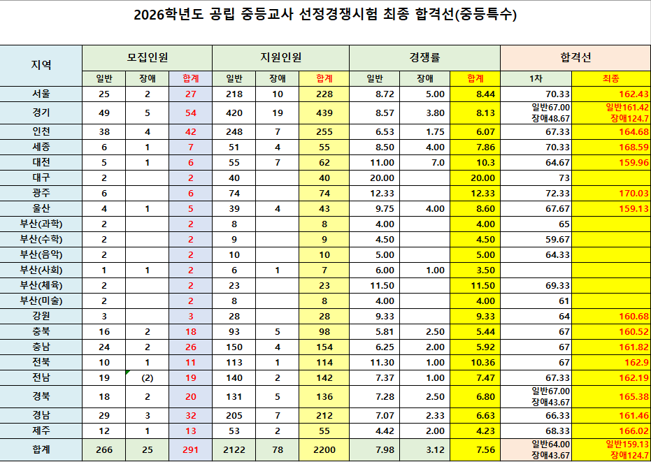 2026학년도 공립 중등 특수교사 임용후보자 선정경쟁시험 최종 합격선 종합본 안내드립니다.