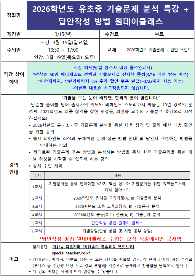 3월 15일(일) '2026학년도 유초등 기출문제 분석 특강&답안작성 원데이클래스' 특강 안내드립니다.