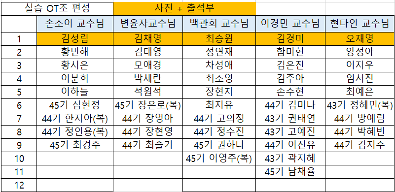* 노란색으로 표시 된 김성림, 김채영, 최승원, 김경미, 오재영 선생님은