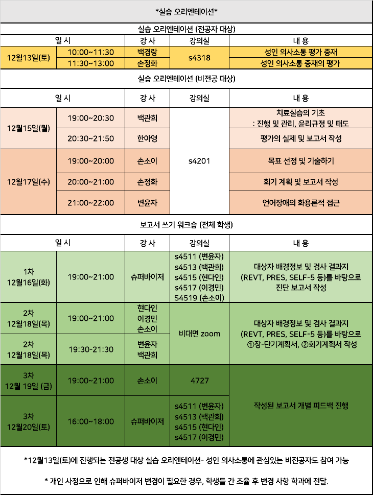 → OT 불참 시 실습 진행 불가하므로 반드시 참석 바랍니다. - 12월 13일(토) 전공생 대상 오리엔테이션은 성인 의사소통에 관심 있는 비전공자도 참여 가능합니다.