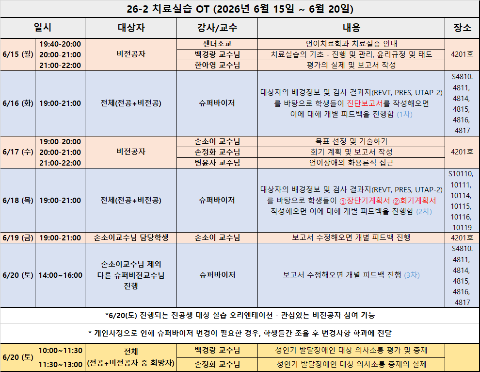 📣 26-2학기 치료실습 OT 일정 안내드립니다.