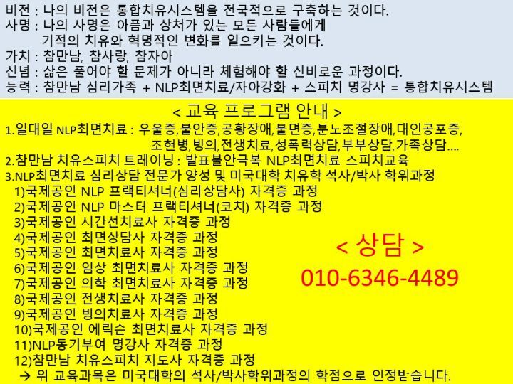 NLP마스터 프랙티셔너(화법/커뮤니케이션/언어의마법)자격증 & 참만남 심리가족 세미나(발표불안극복 치유스피치훈련)-->NLP최면치료전공 대학원석사/박사학위과정)