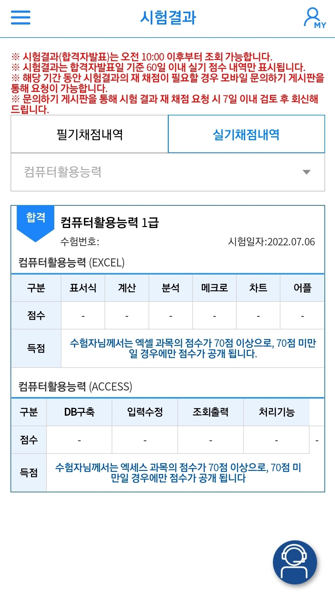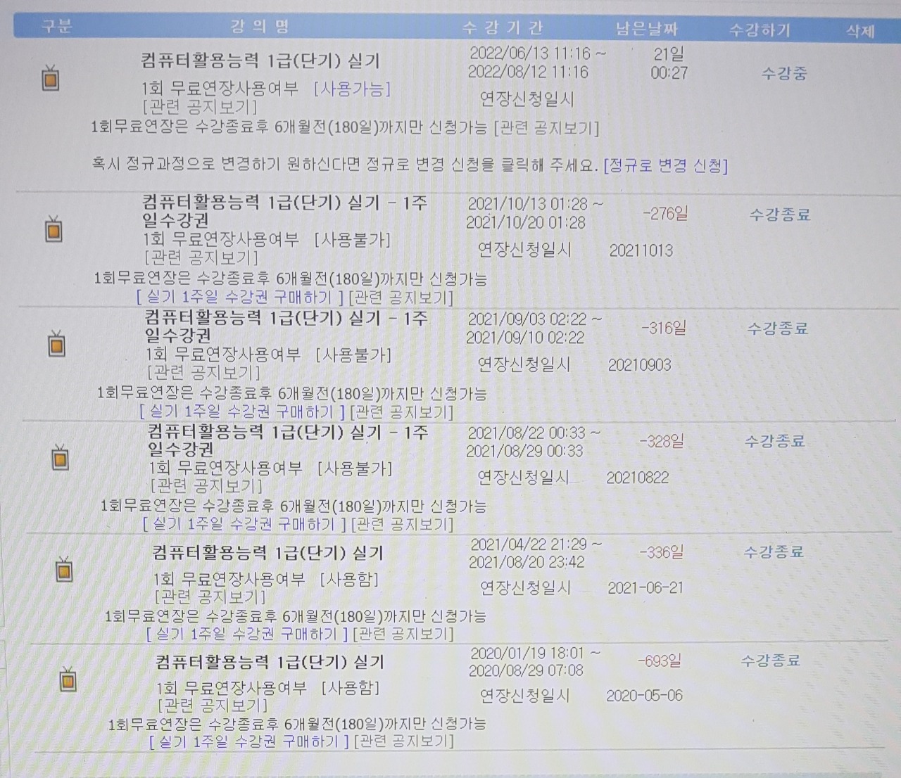 계속 자리를 보다가 접수가 되어서 2번 접수를 했는데 이번에는 엑셀에서 둘다 떨어지고, 엑세스는 붙었어요. 그런데 제가 2020년,,위에서 말했듯이 취업준비 때문에 1급을 취득할 기간이 안될거 같아서 2급으로 갈아타서 2급을 취득했어요.. 1급을 결제하시면 2급 맞춤 강의가 있으니 1급을 하다가 도저히 안되겠다 싶으신 분은 2급을 선택하는 것도 좋은 방법이 될테니 참고하세요! 2급을 따긴 했는데 가산점이 1점밖에 안되서 조금 있다가 다시 1급을 도전했습니다.. 첨부한 사진을 보시면 처참합니다.. 결제를 여러번 한 이유가 있겠죠,,? 취업 공부+ 자격증 공부를 하다보니 시간도 부족하고, 1급도 안하다가 다시 하려니 맥이 빠지더라구요.. 아무튼! 어찌어찌하다가 올해 다시 결제를 해서 총 7회독 정도 하고 첫 시험에서 합격했습니다!!!!! 시험을 6번 접수 했는데 5번 시험을 보고 1번은 내일 시험이 있는데 오늘 첫번째 시험 결과에서 합격이 나왔어요.. 엑세스에서 처리기능에서 1문제밖에 못맞춰서 떨어졌구나 생각하고 내일 시험 준비를 하는데 ,, 놀랍게도 합격,,,;;; 소리질렀습니다..ㅋㅋㅋㅋㅋ
