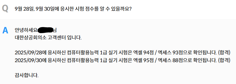 어려웠던 10월 4일 시험은 아직 결과는 나오지 않았고, 쉬웠던 2개 시험은 가채점으로는 전부 100점이었는데 점수 문의를 해보니 100점은 없더라구요 ㅎㅎ.. 합격점수 궁금하시면 상공회의소 고객센터 문의하면 됩니다.