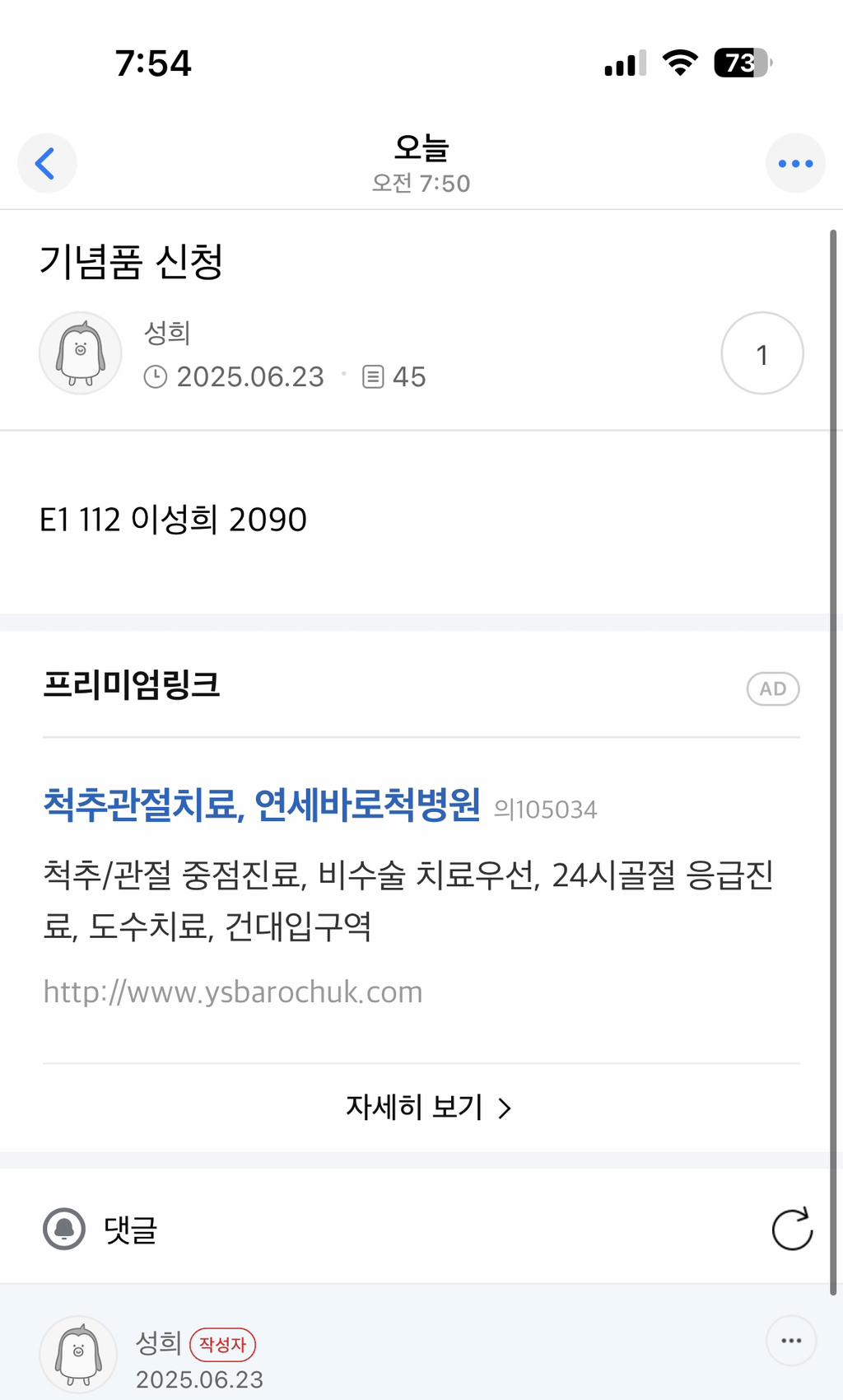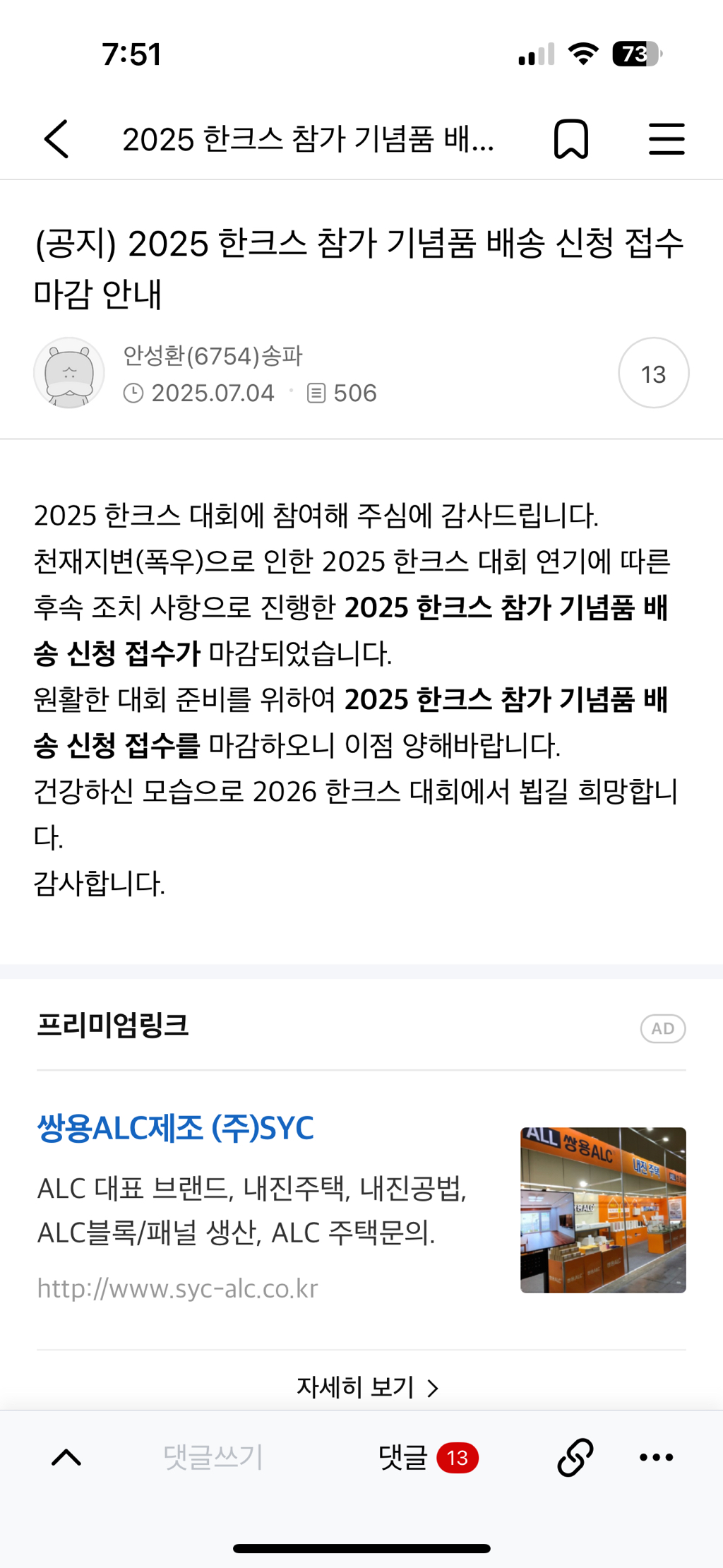 한크스25,참가배송품 누락건 작성자성희|작성시간25.11.15|조회수82 목록 댓글 1 글자크기 작게가 글자크기 크게가 참가안하면서 배송품만 받기로 게시판 신청 했는데 대회종료가 언제인데 아직까지 안오나요이것또한 누락인지요? 다음검색 현재 게시글 추가 기능 열기 북마크 공유하기 신고 센터로 신고 댓글 댓글 1 댓글쓰기 답글쓰기 댓글 리스트 해당 댓글은 작성자와 운영진만 볼 수 있습니다. 댓글 전체보기