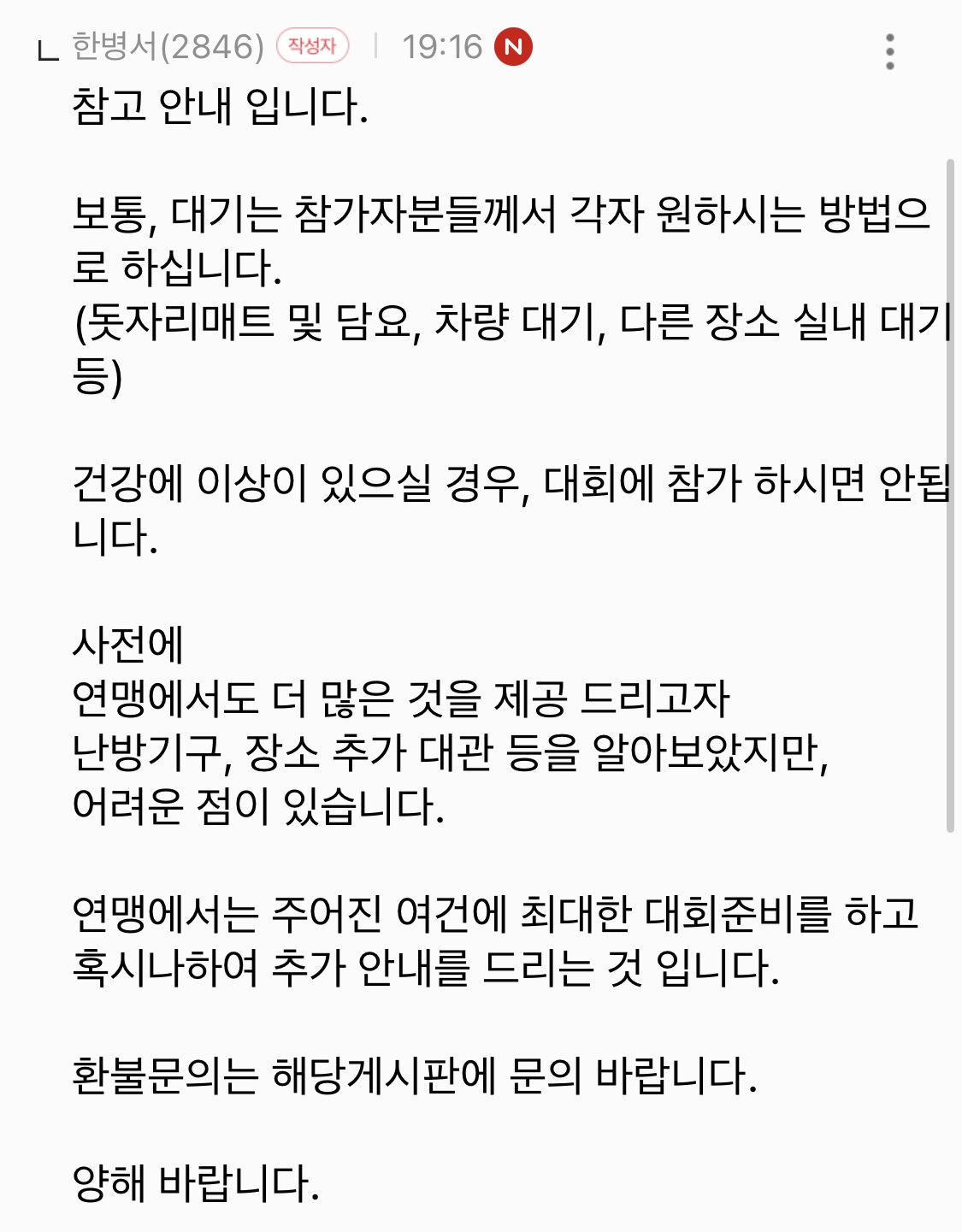 저도 행사 업무를 진행해봐서 알지만 난방기구 대여는 어려운 일이 아닙니다. 연맹이 무책임한 태도로 방관하다 대회 직전에 송파구청에서 지시하니 급급하게 진행하느랴 생긴 일 아닙니까?