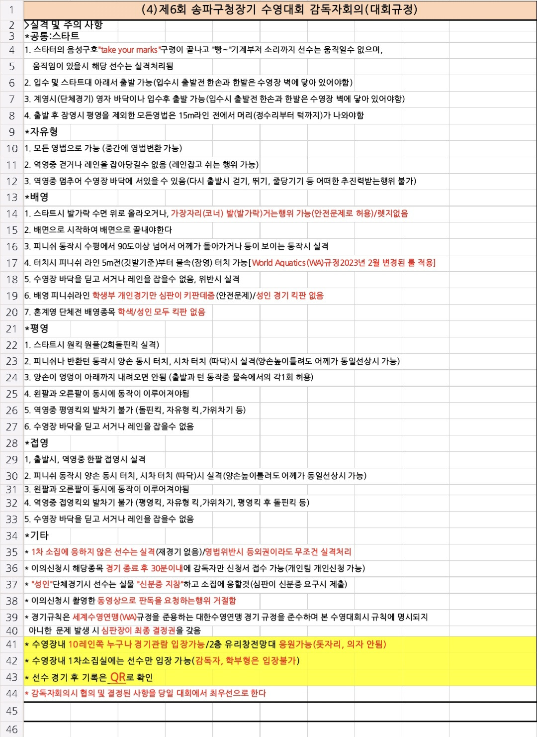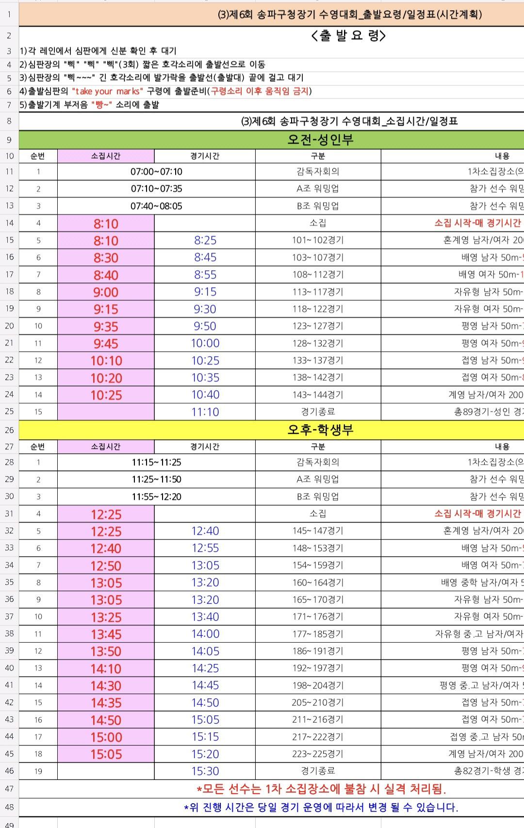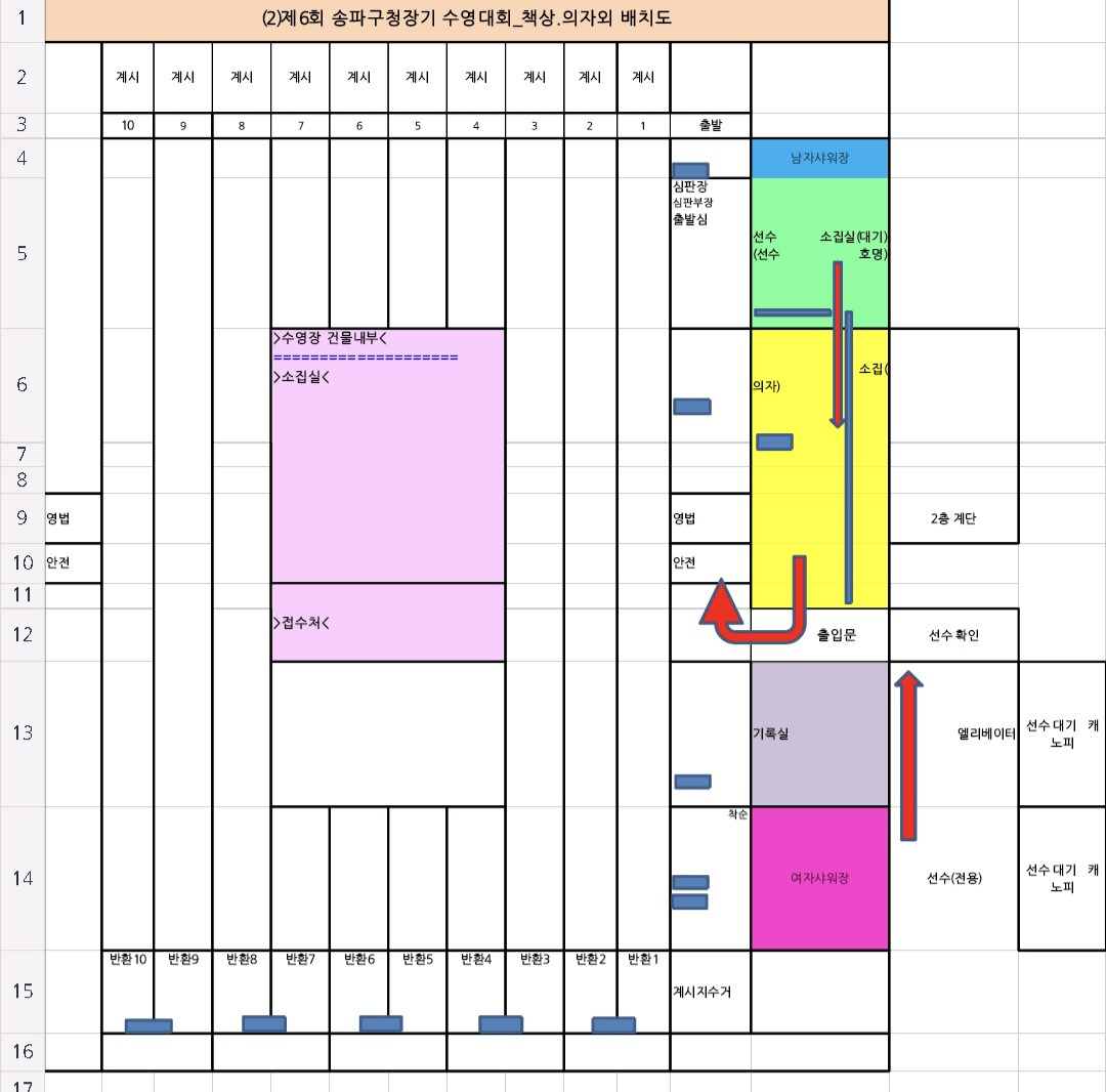 ■ 아래 내용을 반드시 확인 바랍니다. 1) (★중요★) 감독자 분들께서는 '감독자 회의전'까지 '단체전 명단 서류'를 '기록실'로 제출하시기 바랍니다. (이메일로 제출하신 분께서도 다시 한 번 제출 바랍니다.) 2) 3개시트 확인 안내. (수영장 배치도, 경기시간, 경기규칙) 첨부파일: ▼ |