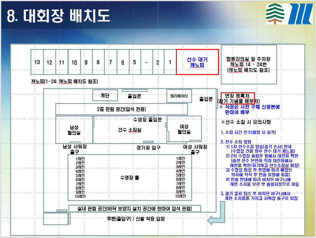 1. 대회에 참가하는 선수분들은 안내된 대회 운영 시간표를 확인하여 해당 경기 시간 30분 전에 수영장 외부 선수 대기 캐노피에서 대기합니다.