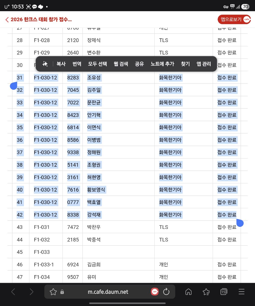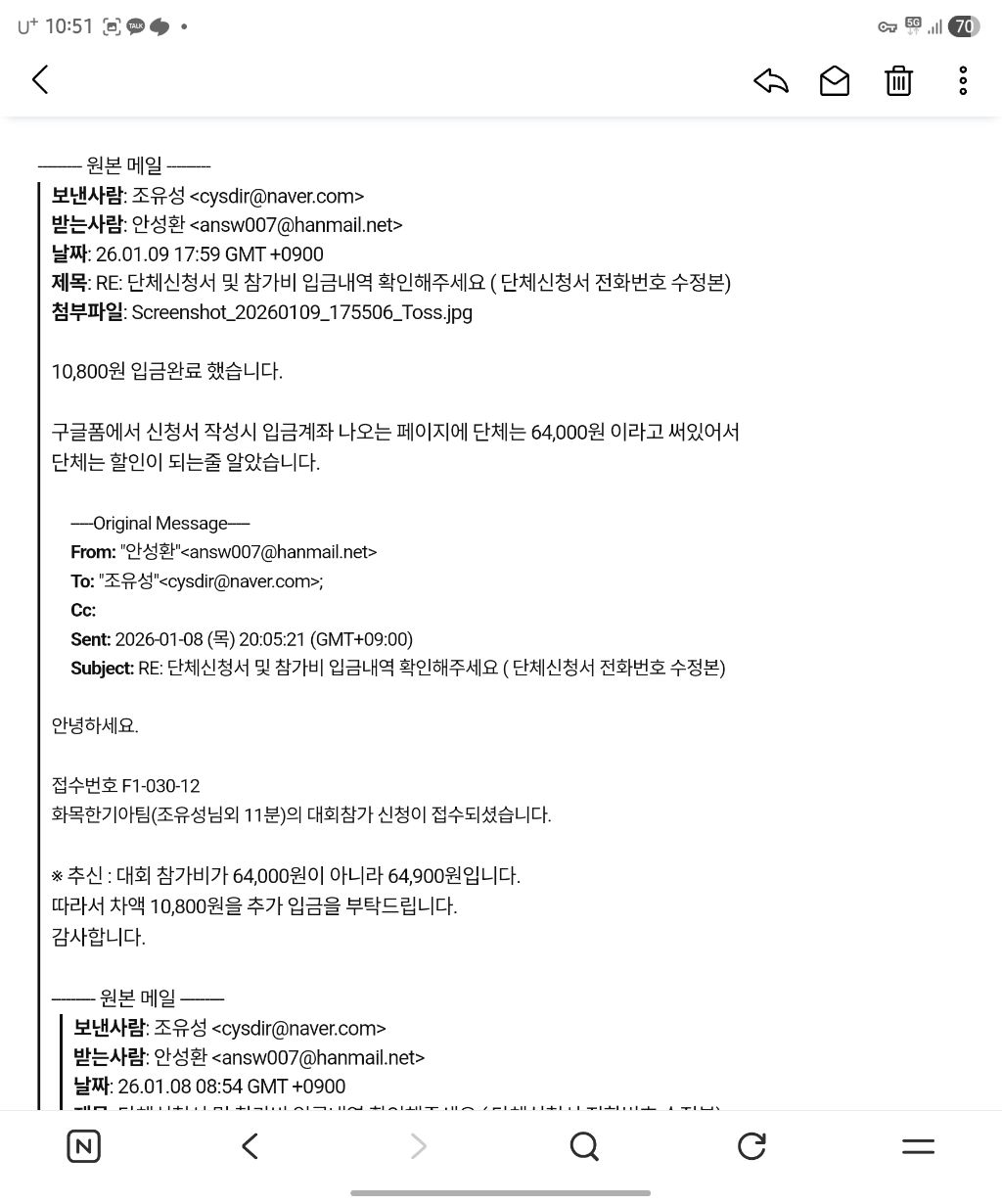 대회참가비 미입금 문자가왔는데 누락된거같아 확인부탁드립니다. 작성자조유성(8283)|작성시간26.03.21|조회수47 목록 댓글 2 글자크기 작게가 글자크기 크게가 6월 20일(토) F1-030-12 , 12명 입니다.1월 7일 입금하였고, 부족분이 있어서 1월9일 추가입금 하였습니다.확인 부탁드립니다. 다음검색 현재 게시글 추가 기능 열기 북마크 공유하기 신고 센터로 신고 댓글 댓글 2 댓글쓰기 답글쓰기 댓글 리스트 작성자안성환(6754)송파 | 작성시간 26.03.22 문자를 받으신 분이 어느 분이신지요?화목한기아팀에서는 안내문자가 발송되신 분이 없으신데... 작성자조유성(8283) 작성자 본인 여부 작성자 | 작성시간 26.03.24 개인 조유성(8283)으로 신청했다가 다시 총 12명 단체 신청을 했는데개인신청이 미입금으로 취소되고 단체(화목한기아)는신청이 되었다는거 같은데 맞나요? 댓글 전체보기