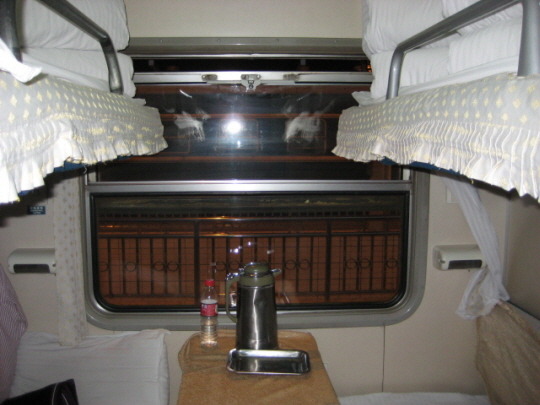 물렁침대칸 모습입니다. 보온물병 있고요... 침대맡에 개인 전등 보이시죠?