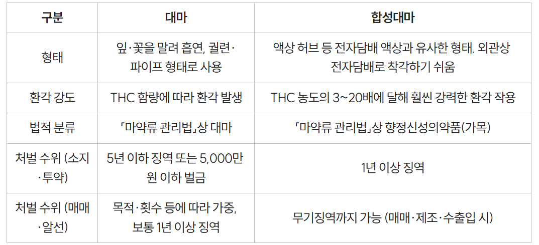 합성대마는 다른 화학성분과 합성한 대마로 대마초가 아니라 향정신성의약품으로 분류되어 가중된 처벌을 받는다.