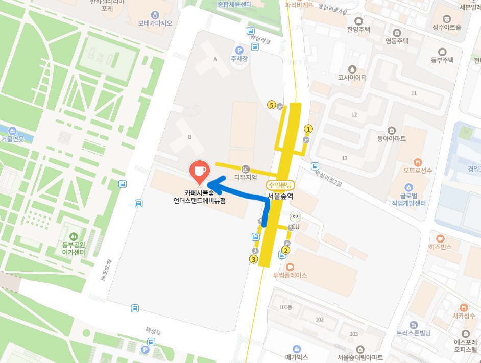 만남; 서울숲역3번출구옆 카페서울숲 9시50분(지도 참조) 아침에 추우니 따듯한 커치나 차한잔하고 출발