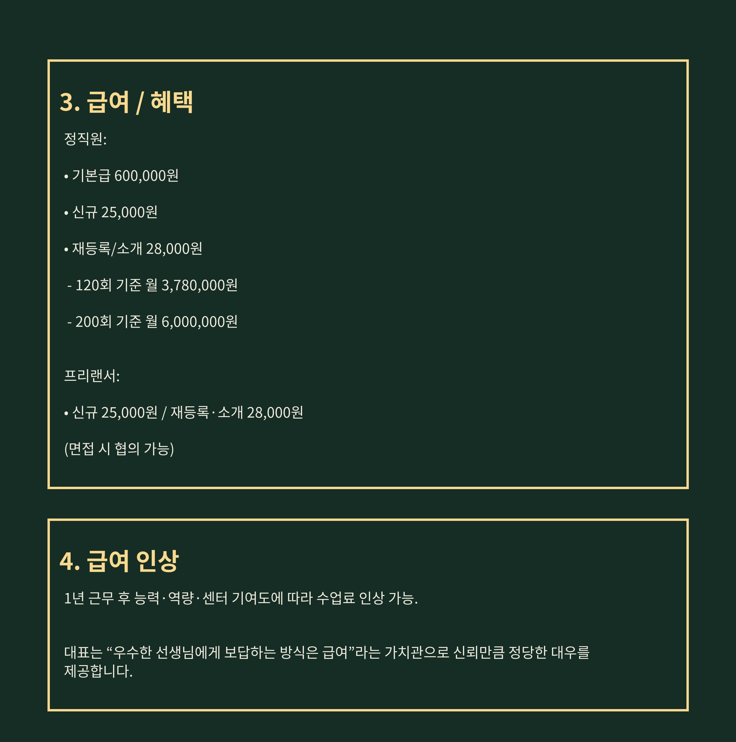 우수한 능력의 선생님께는 걸맞은 대우를 해드립니다.