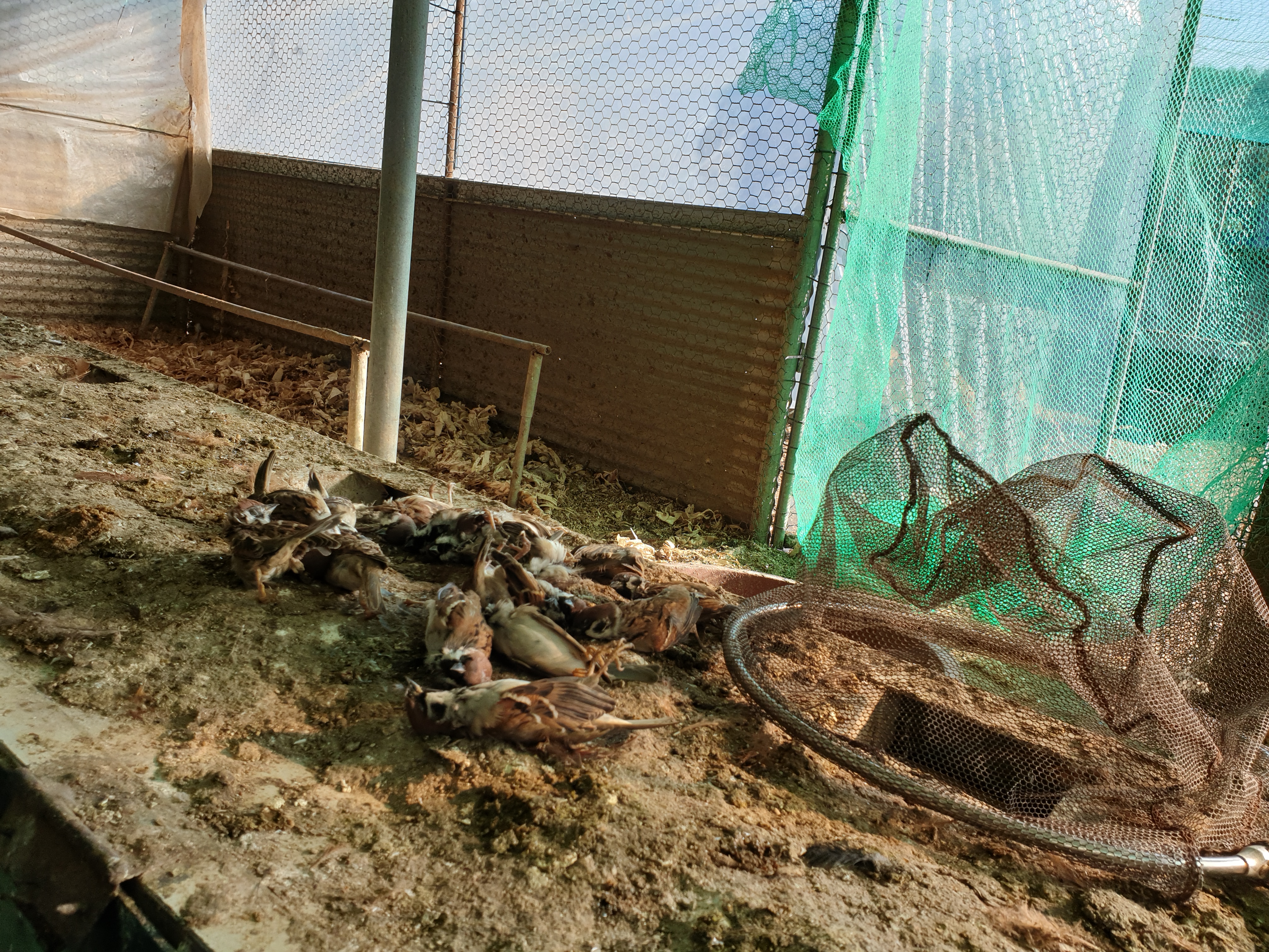 우선 구석구석 빈틈을 모두 막았다. 그리고 틈이 많은 문쪽엔 구멍이 좁은 그물을 쳤다. 이 그물은 평소에 말아 올려 닭들이 드나들게 하고, 내가 참새를 잡으러 닭장에 들어서면서 내릴 수 있게 했지.